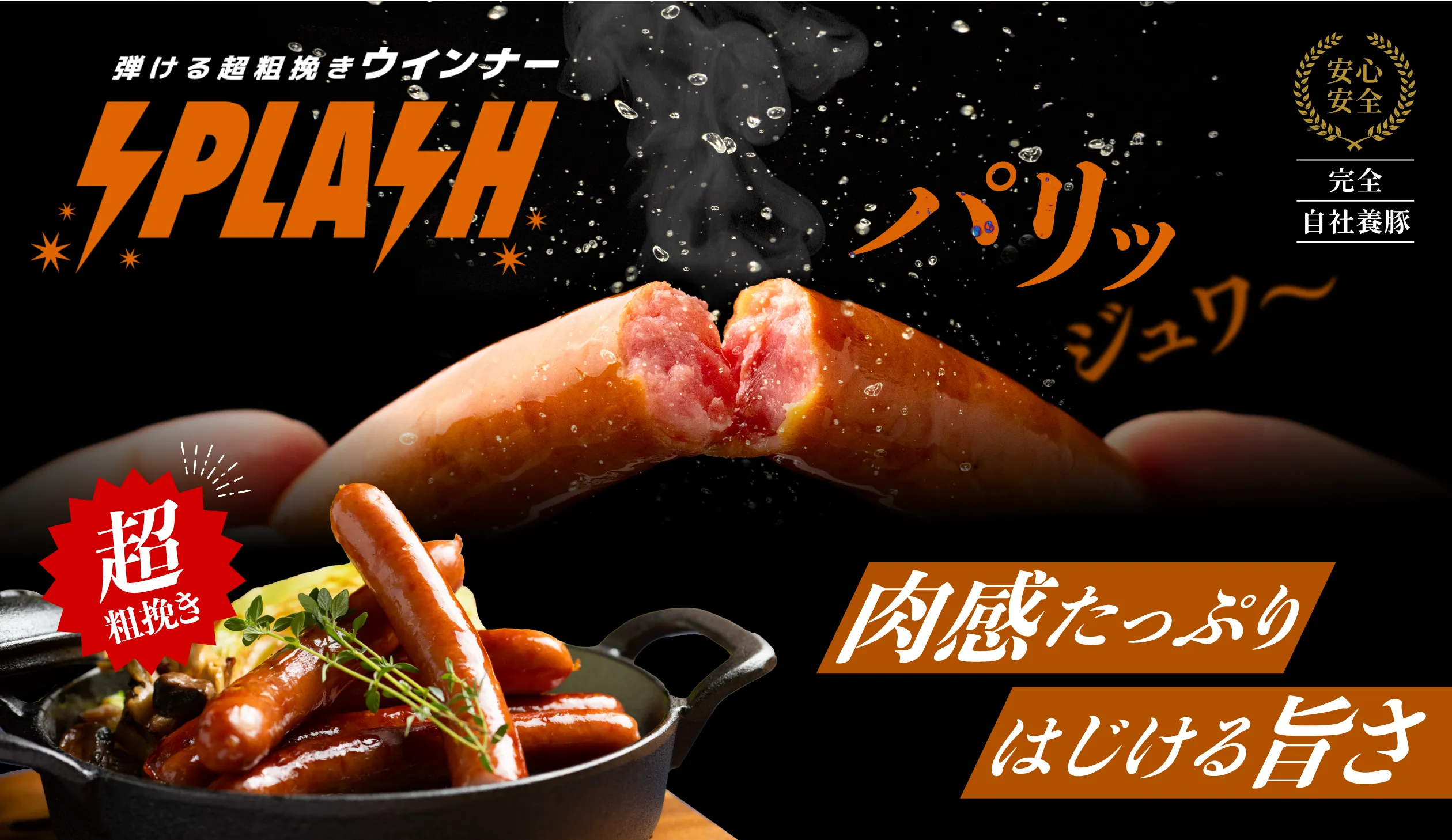 ジューシーな肉汁はるのポークのウィンナー「スプラッシュ」は噛んだ時に、肉のうま味と脂の甘さがバランスよく感じられるウィンナーです。